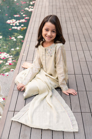 The intricate handwork of Naqshi, Dabka, French knots, and shimmering stones graces the sleeves, neckline, side hems, and back, creating a symphony of meticulous artistry. Even the trouser buttons feature fine embellishments, adding an element of refined luxury.