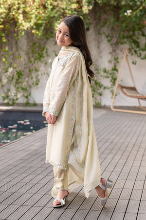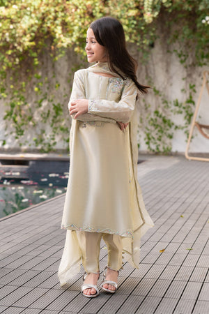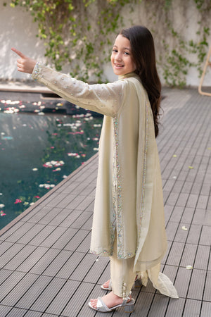Drenched in the brilliance of lime yellow, Aurora is a celebration of heritage craftsmanship with a modern touch. The Zari Khadi shirt shimmers with a rich texture, perfectly complemented by pure sheesha silk straight pants and a medium silk dupatta adorned with delicate organza borders and sparkling stone details.