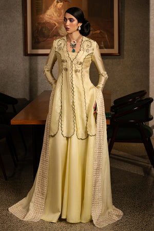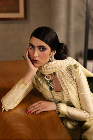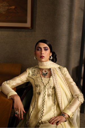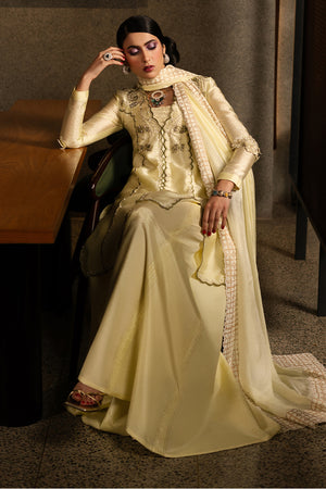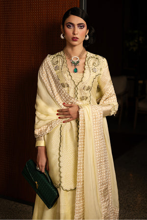 Limelight Highlight, a stunning piece that combines traditional elegance with modern charm. This V-neck panelled shirt features a block-printed design, beautifully complemented by exquisite embroidery and embellished front panels, enhanced with a scallop detail for added sophistication. The three-quarter sleeves are elevated with three-dimensional scalloped florals at the elbow level, creating a graceful, feminine touch. Paired with a flared sharara, the outfit exudes fluidity and movement, while the medium silk dupatta adds a luxurious finish, with an embroidered scalloped block-printed border that ties the whole look together. Perfect for making an impression, Limelight Highlight radiates timeless beauty with every wear.