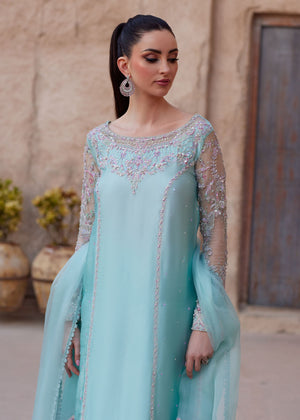Discover our stunning Powder Blue ensemble, featuring a long straight shirt crafted from delicate Tissue Silk with refined princess side panels adorned in intricate Ada hand embroidery sprays. The shirt is elevated by a heavily embroidered front neckline and an equally detailed embroidered back neckline, seamlessly combining precision machine work with exquisite hand-crafted Ada detailing, and completed with fully embroidered Organza sleeves. Paired with flared trousers in smooth Korean Raw Silk, finished with a chic organza frill at the hem, the look is brought together with a two-toned Organza dupatta, featuring delicate embroidery and spray work on the pallu, creating a sophisticated and artfully crafted ensemble perfect for formal occasions.