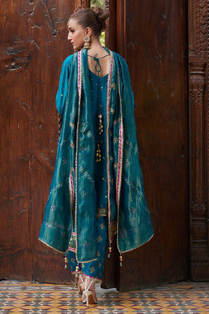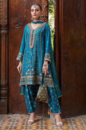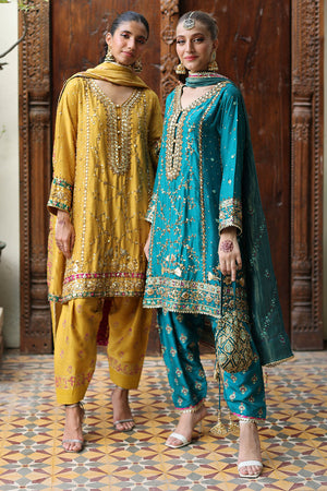 Step into the spotlight with 'Lina’' a radiant Mehndi outfit that captures the essence of pure elegance. The Teal three-paneled box kurta exudes grace and charm, while the khari shalwar adds a touch of traditional flair. Adorned with delicate Gota, nakshi, and dabka work, the shirt sparkles like stars, making you the center of attention at every turn. 'Lina' is the epitome of cool sophistication, adding a touch of golden hues to your Mehndi celebration.