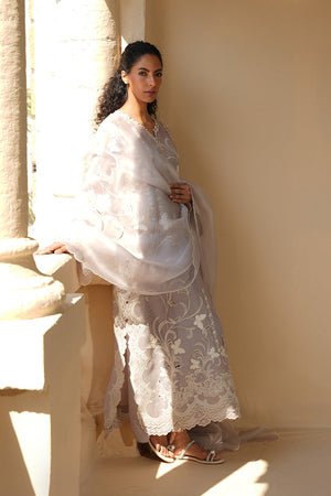 An ethereal lavender ensemble is adorned with delicate ivory embroidery and eyelet details, reminiscent of botanical artistry. Crafted from khaddi corduroy, the kaftan exudes elegance with a scalloped hemline, intricate butterfly applique, and flared sleeves. Sheer organza scalloped dupatta adds flamboyance to the elegant silhouette. Paired with a pure rawsilk trousers and a slip cut from crepe.