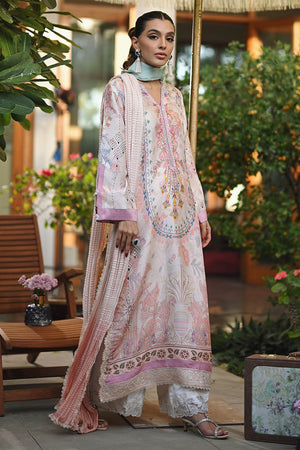 Presenting Liora - a refined white digital print featuring accents of purple, pink, and blue. The design is complemented by a hand-embellished neckline with lace detailing along the border and graceful.