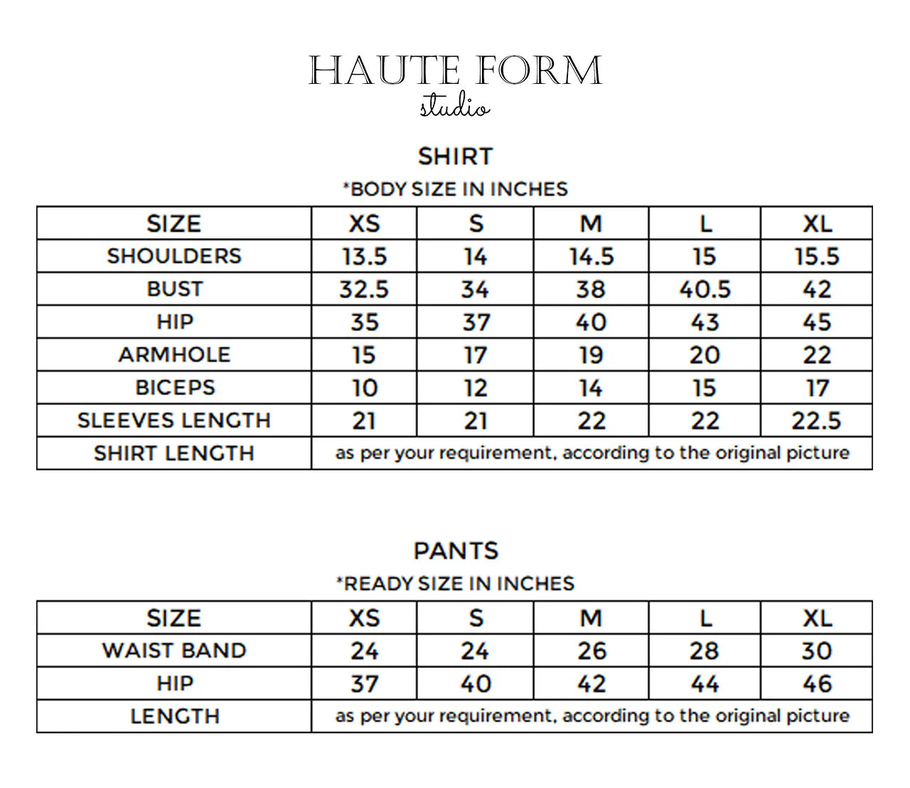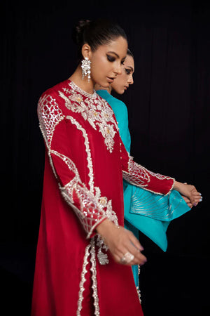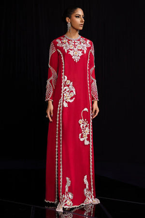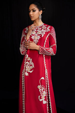 Long shirt in pure raw silk in ruby red color with embroidery in white thread and topped with heavy hand embellishment that includes pearls, Swarovski stones, dabka, 3d pipes, glittery gota pati. It is featured with two front slits in each panel showing off the plain red tailored cut bootcut pants. Focusing much on the details, slits have embellished borders too. Pants are made in pure Thai silk fabric. Sleeves have shiny sequined jaal with pearls outline.