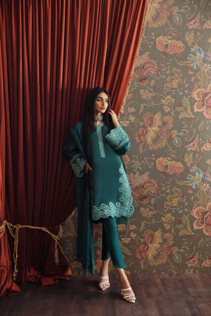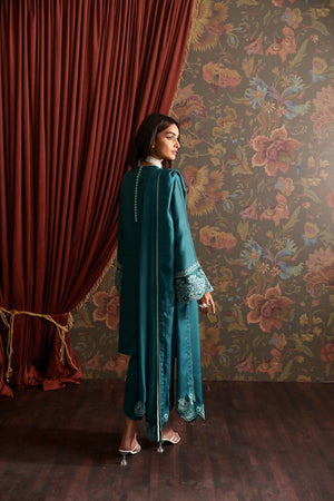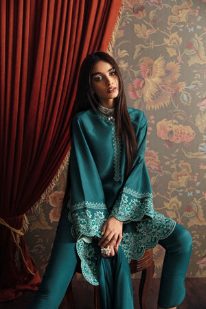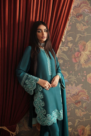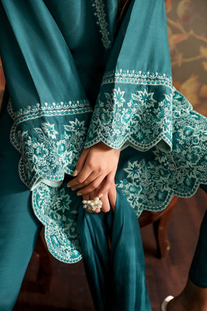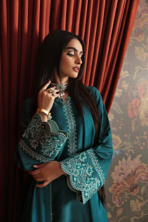 A stunning sea green raw silk mid-length shirt with embroidered neckline and heavily embroidered sleeves and hem borders. paired with straight-fitted pants. Completed with silk dupatta with embroidered pallus with stitching details .