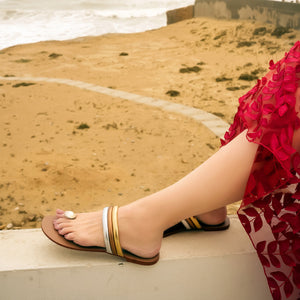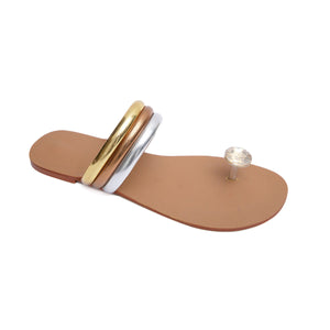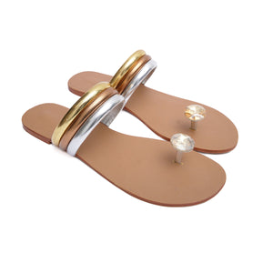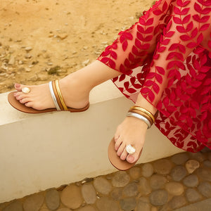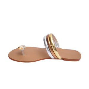 All about mixed metals when it comes to this trendy pair. The Liza flats are a no-fuss pair with a minimalistic yet impactful charm. This cult-favorite silhouette features a sparkling gem on the toepost and a sturdy strap in gold, silver and bronze that keeps the foot in place.