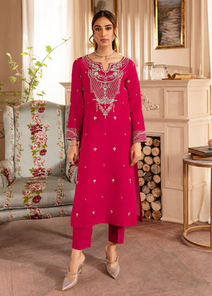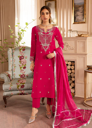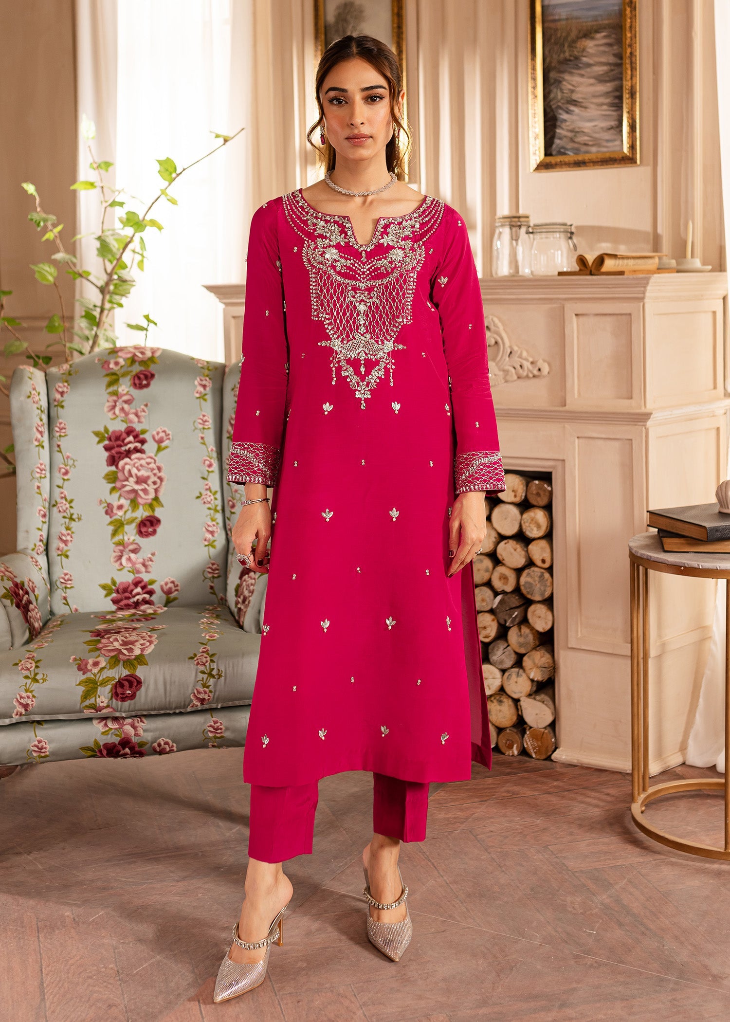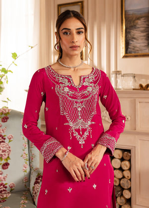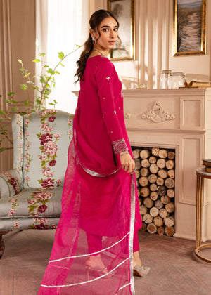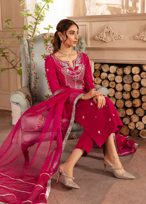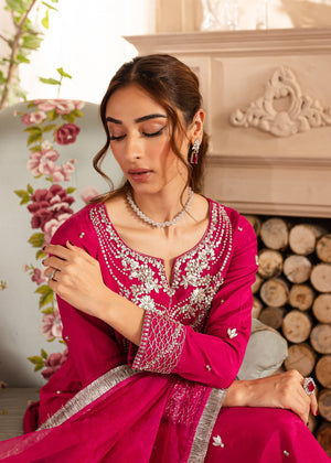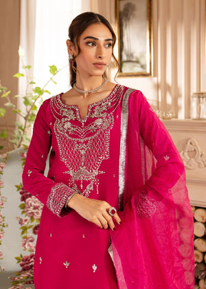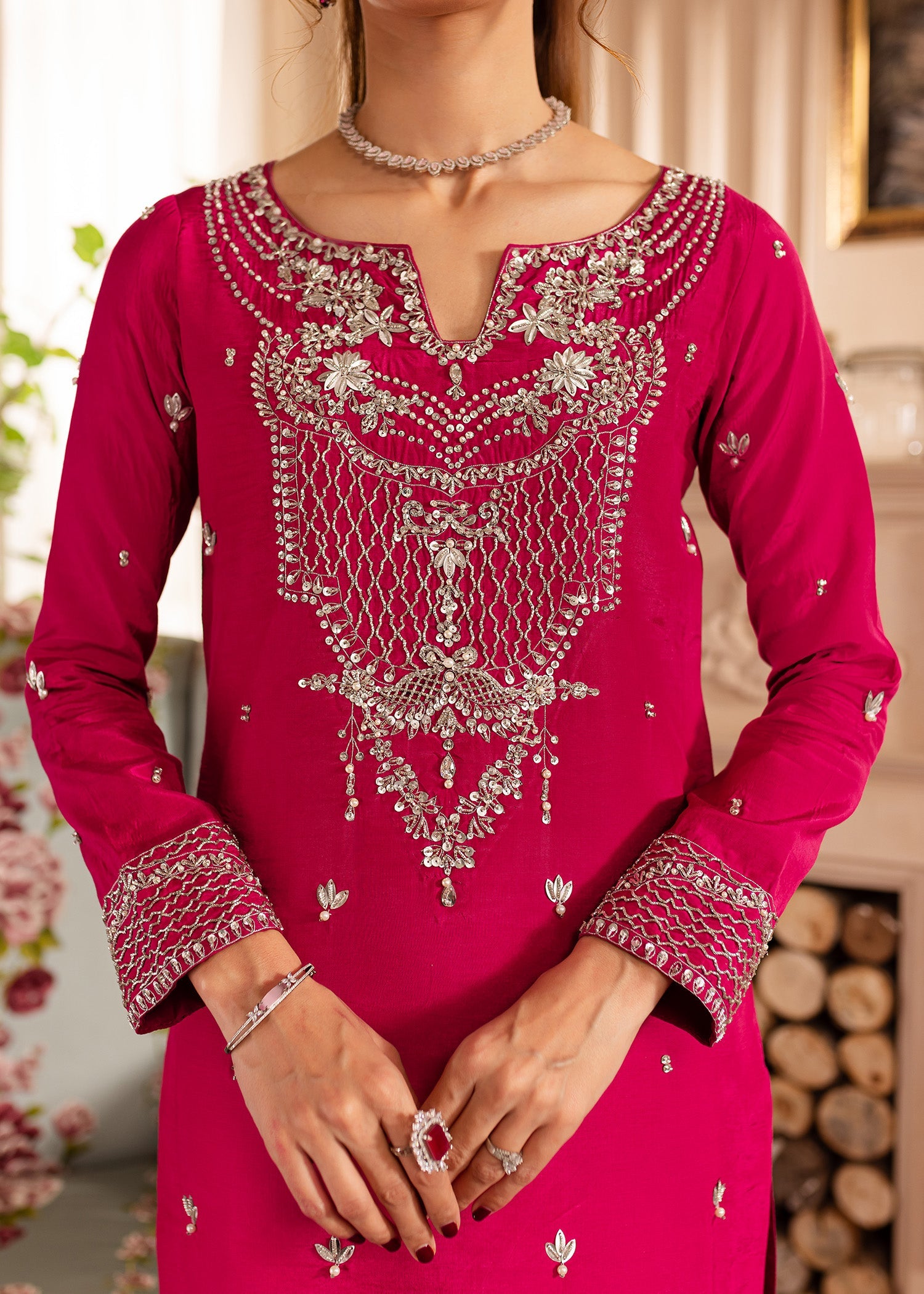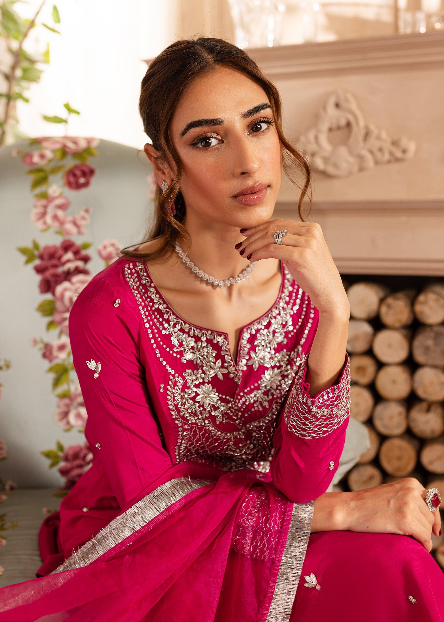 A splendid Hot Pink ensemble has delicate neckline beautifully embellished with silver Mukesh work and also dainty embellishments of silver pipes, sequin, buggle beads, dabka and naqshi. It comes with straight pants & Organza dupatta with Gota and four sided kiran.