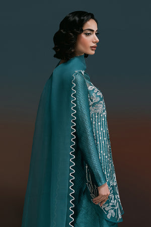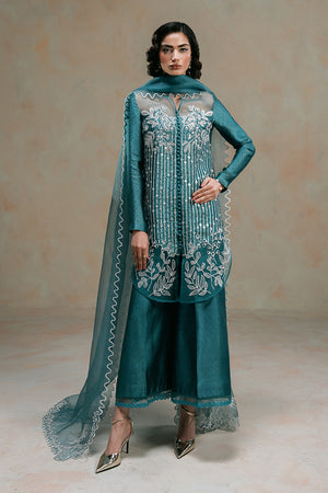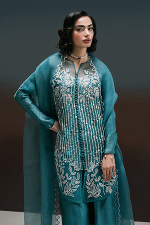 London Bling – A Statement in Elegance. Drenched in a rich teal hue, London Bling is a perfect blend of sophistication and charm. This mid-thigh self-tissue silk shirt is adorned with exquisite embroidered florals and delicate sequin embellishments, creating a mesmerizing play of texture and shine. The patched organza neckline and daman, accentuated with intricate button detailing, add a touch of refinement. Paired with elegantly embroidered culottes, featuring a scalloped organza border with lace accents, and a graceful organza dupatta with scalloped embroidery and corner detailing, this ensemble is a celebration of artistry and timeless fashion.
