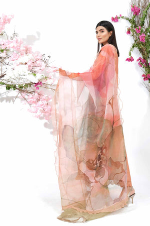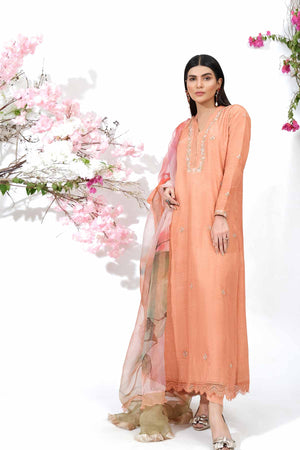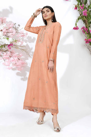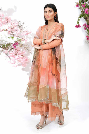 Light rust silk outfit with tilla and thread work. It comes with digital printed organza dupatta.Collection: Eid Edit II