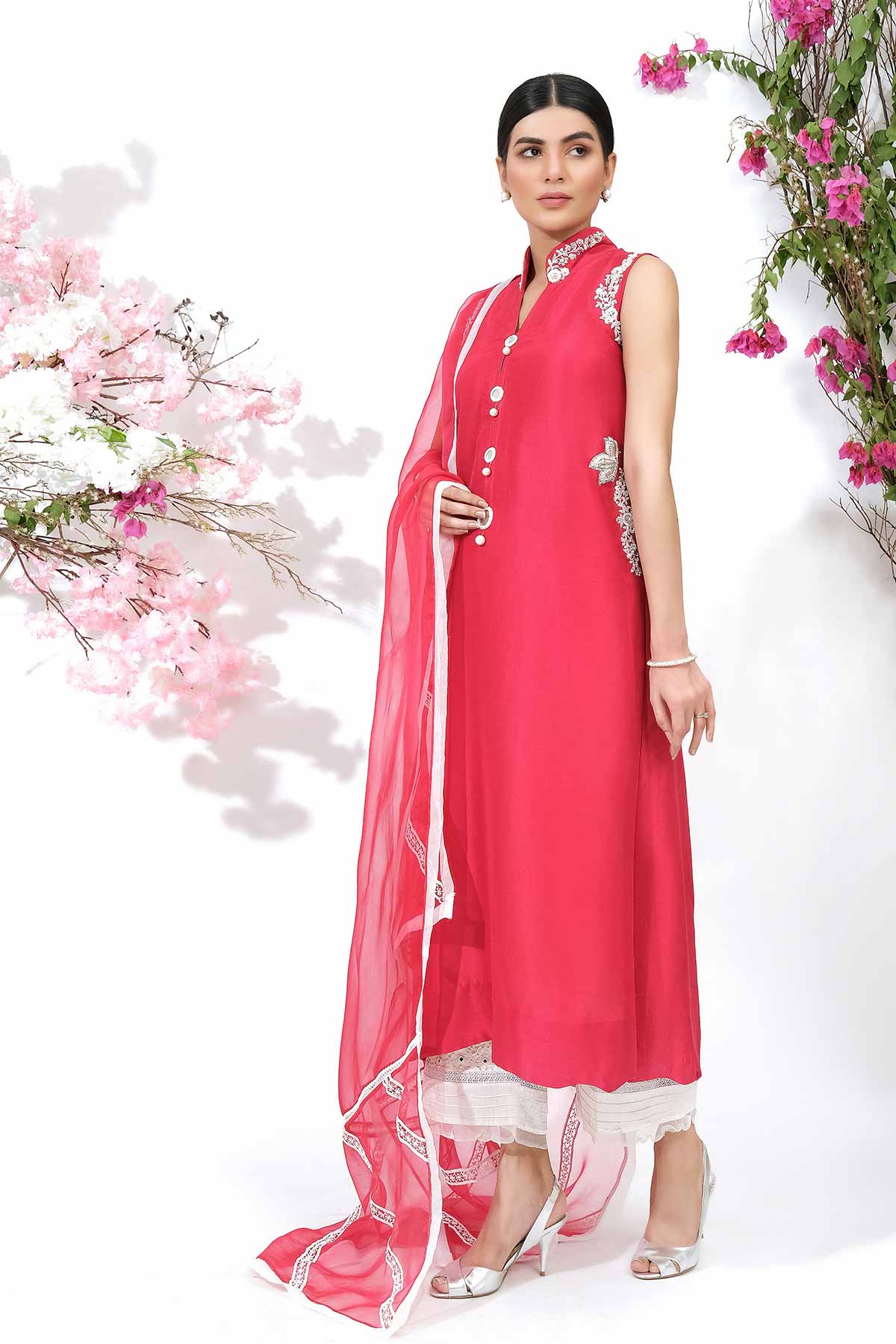 Ravishing red and white outfit. The shirts comes in pure silk with intricate hand embroidery thread,Pearl and Mirror work.Collection: Eid Edit II