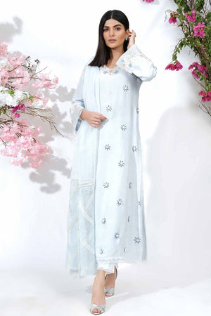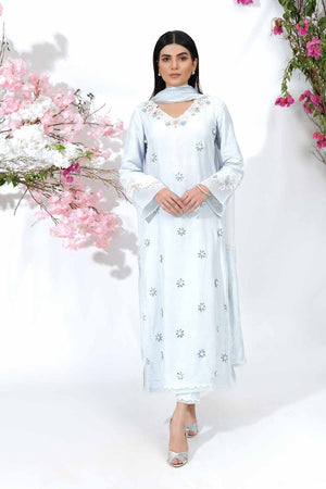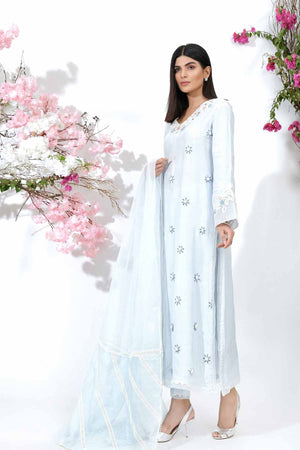 Sky blue silk outfit with cutwork neckline and sleeves border. The shirts front has block print spray with Mirror work.Collection: Eid Edit II