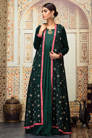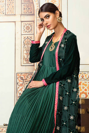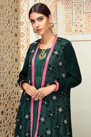 Long green jacket with velvet applique and hand work. Back and sleeves velvet.Color: Green