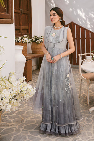 Shaded Grey Long crush dress with hand embroided beautiful work on bodies. The meterial of dress is Koreen Raw Silk Overcoat is pure organza and dupatta is cotton net