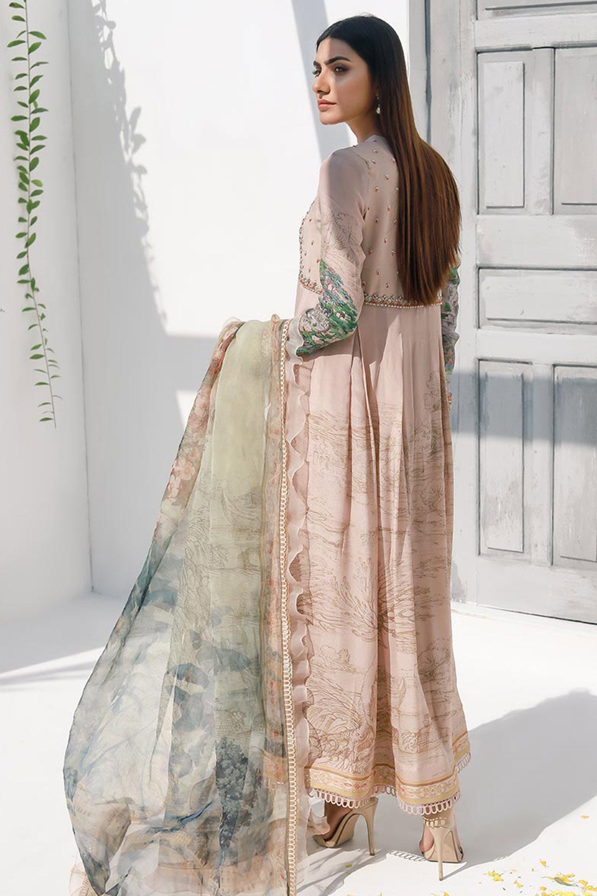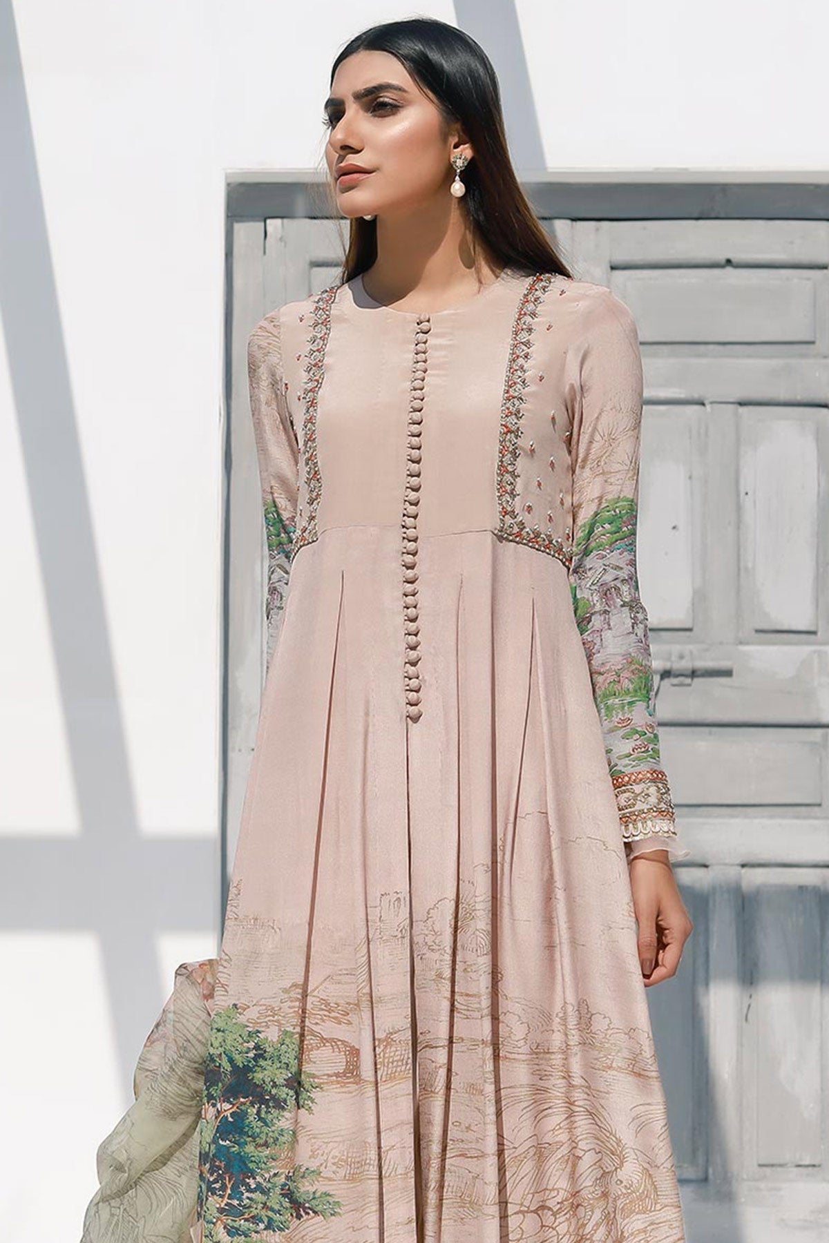 Traditional Anarkali frock style with box pleat.Digital printed pure crepe silk hand embellishment on front and back body and sleeves embellished with dabqa,pearls and sequins embellisments. Finish with organza, kingri and lace. Glamourise your outfit with digital printed dupatta finished with kingri, lace and organza frill.Color: Peach