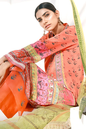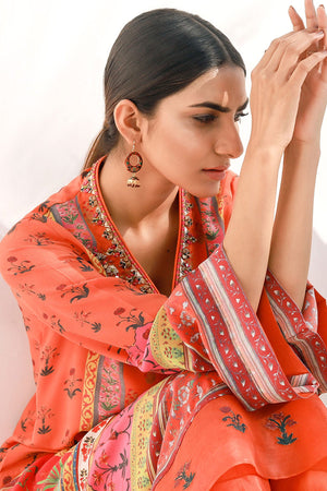 This pure traditional look is just what you need. A pure Crepe shirt enhanced with a beautiful digital print with hand embellished neckline in gold sequins, joot dori in pink, french knots of dabqa and little touch of different colors. Accompanied by digital printed dupatta with teasel pearl lace.Fabric: Grip, Korian, Pure Organza