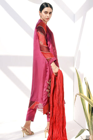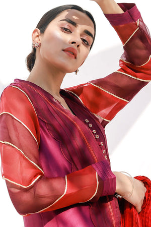 Plum color shirt with nice combination of plum-red pure crepe silk. center of the shirt is beautifully detailed with pleats and hand embellishment of sequins, dabka and single resham on the neckline, ham and one side of the shirt. On the other side two colors, chatapati red and plum. The dress can be paired with a crush dupatta with chata pati border on both side.Fabric: Pure Silk, Pure Organza, Medium Silk, Korian Silk