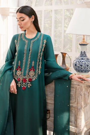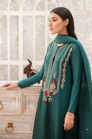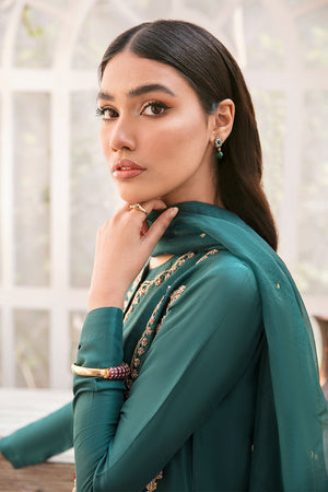 Captivity shades of green with lovely subtle gold zari sheen are completely hand embellished with zardozi and sequence work. The fabric of this shirt is pure raw silk and it is dyed in a gradient tone.