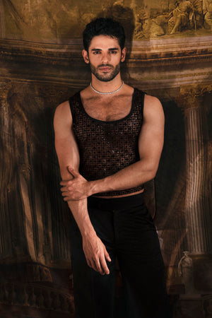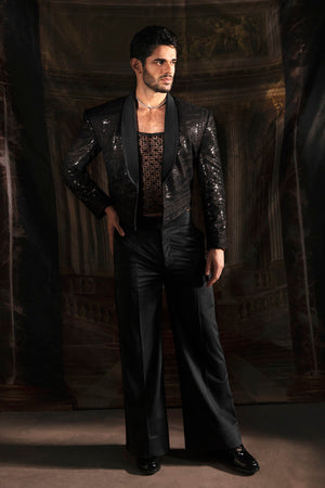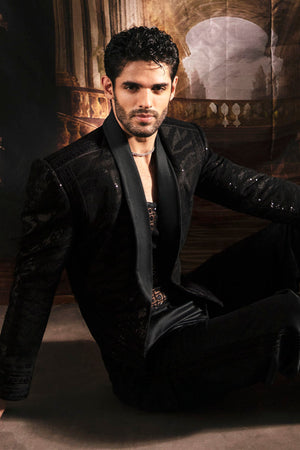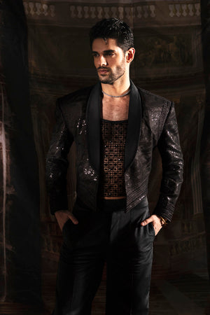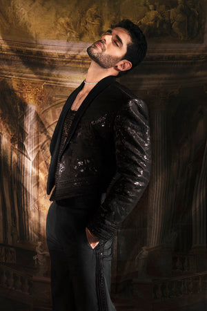 This chic ensemble is the epitome of sophistication and charm. In a deep, lustrous black, it exudes an understated yet powerful allure. The edgy silhouette adds an ethereal touch, giving a distinct and commanding presence. The shimmering sequins and intricate threadwork elevate its elegance, glistening in the light and exuding a magnetic charm. This ensemble encapsulates a perfect balance of sophistication and edge, tailored for the modern man who exudes charisma and confidence with every step.