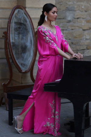 The kaftan, cut from pure charmeuse this candy pink color shade is adorned with embroidered resham, pearls, stones, cut dana, and sequence on shoulders, neckline, sleeves, and daman.