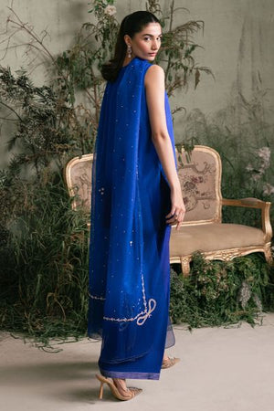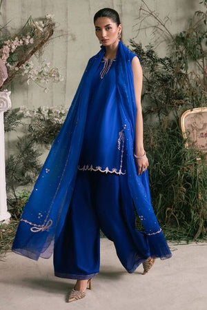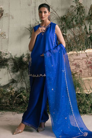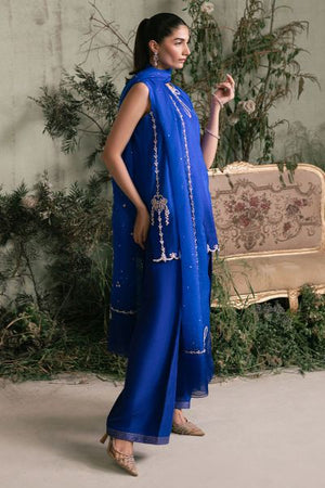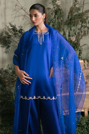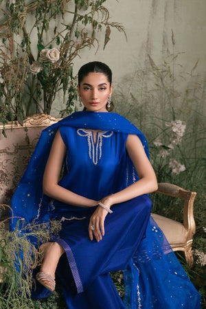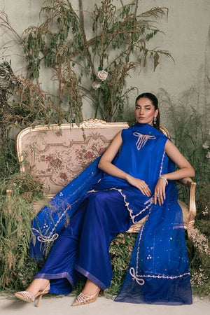 Exude modern sophistication with this stunning blue ombre ensemble. The short scallop shirt boasts a charming handmade bow tie detail, intricately embellished with delicate pink pearls, evoking a chic and contemporary vibe. Paired with a flowing shalwar and an exquisite ombre blue dupatta, this outfit is a masterclass in elegance. The dupatta's four-sided handwork and bowtie edges add an unparalleled level of craftsmanship, while the strategic embellishments provide a touch of luxury. Perfect for formal events, weddings, or high-end gatherings, this breathtaking outfit redefines traditional style with modern flair.