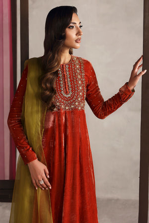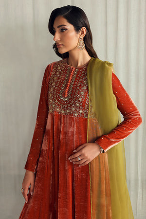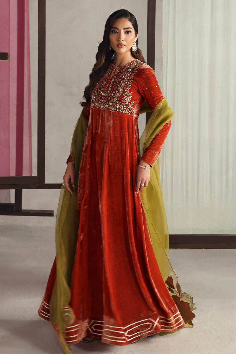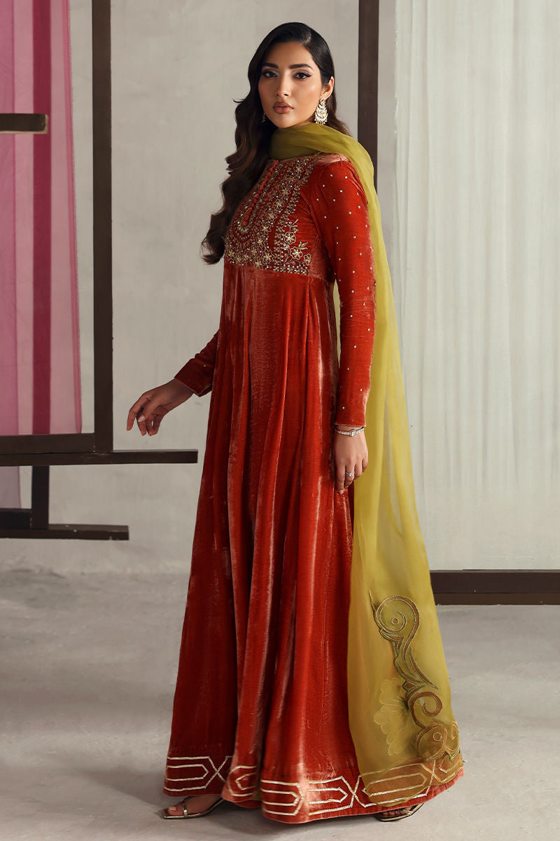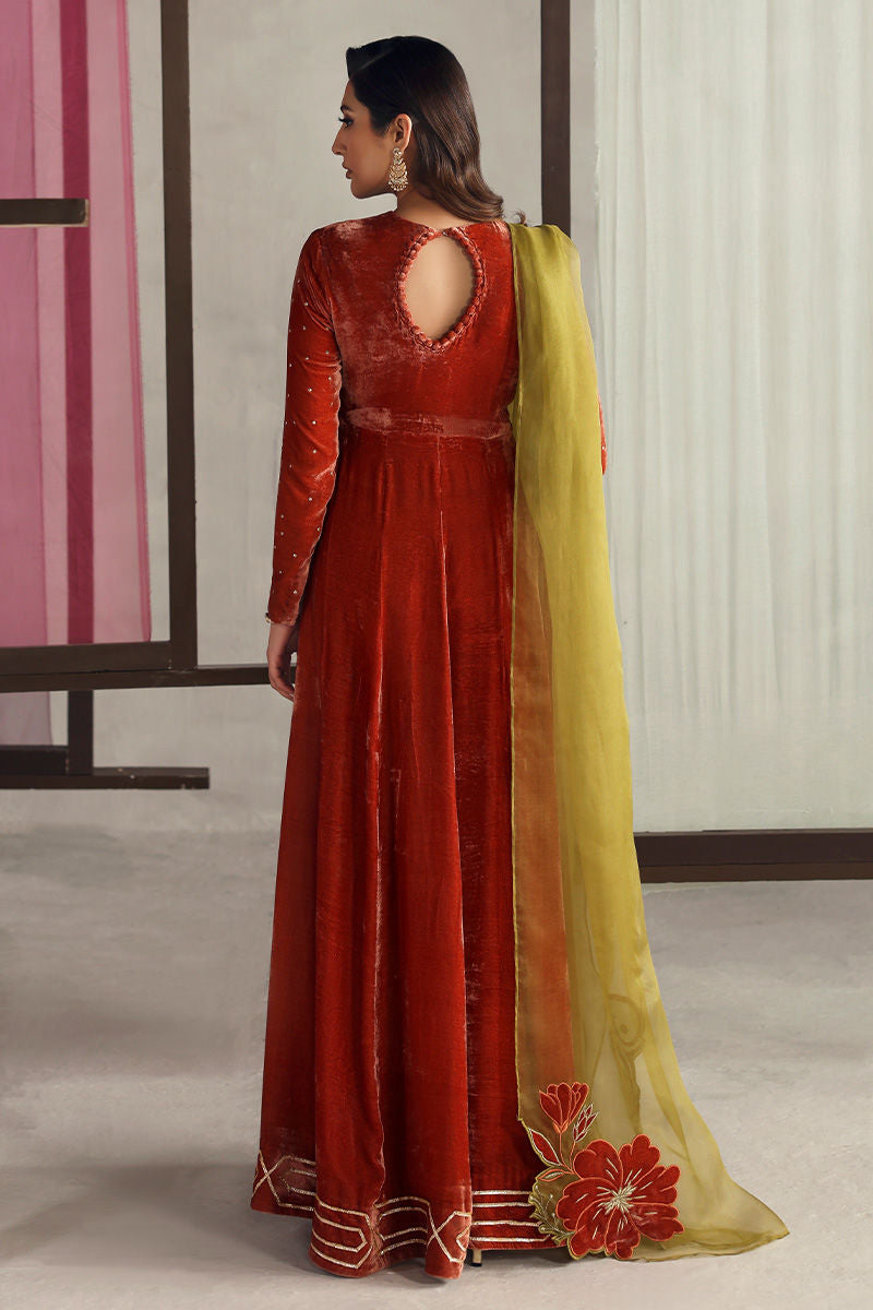 A stunning rust-hued frock crafted from pure velvet, radiating warmth and elegance. Paired with a pure organza dupatta, adding a soft, ethereal charm to the luxurious silhouette.