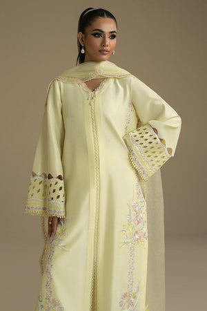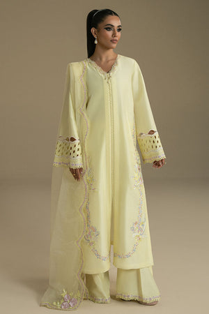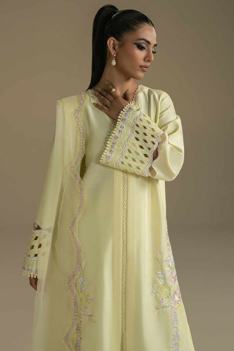 Bathed in the softness of light yellow, this ensemble is a celebration of modern femininity with a whisper of tradition. The shirt features uniquely stylized sleeves that blur the line between structure and fluidity, while delicate pastel-colored embroidery dances across the fabric — a painterly nod to spring gardens in bloom. Paired with gracefully flared pants that lend effortless movement, the silhouette is both contemporary and timeless.The organza dupatta, edged with intricate embroidery and scalloped borders, adds a layer of ethereal charm, catching the light with every step. This look is crafted for the woman who embraces subtlety, elegance, and quiet distinction.