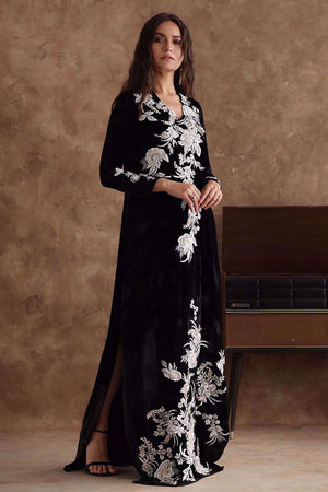 Black majestic kaftan in pure velvet is a perfect attire for winter evenings. The kaftan is aesthetically embroidered with resham, cut dana, sequins, and bead work, to create a subdue look.