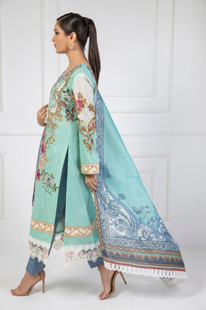 This blooming lawn canvas transforms into a tapestry of dreamy floral composition. Accented with beautiful floral embroidered bunch in front. Paired with coordinating pants and a stunning dupatta, digitally printed to create a seamless contrast.
