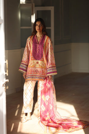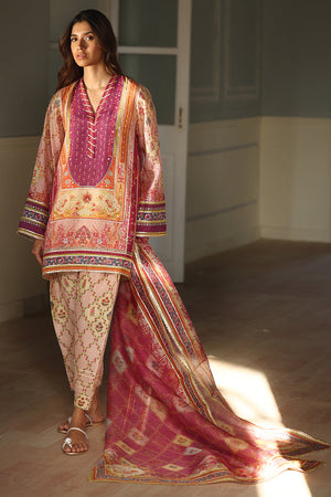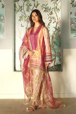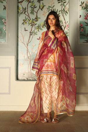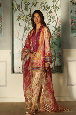 Immerse yourself in luxury with an ensemble featuring a radiant plum and blush hued khaddi silk shirt printed with floral artistry and embroidered with intricate gota accents. Paired with a delicate blush toned, floral printed khaddi silk shalwar with gota details. A cascading medium silk dupatta with an artisanal print in deeper shades of plum and gota borders emanates understated elegance.