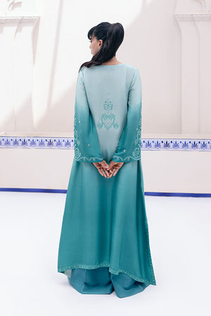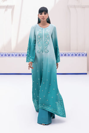 This outfit boasts a teal ombré raw silk shirt adorned with intricate embroidery, cutdana, and sequin embellishments, adding a touch of glamour and sophistication. The shirt is paired with wide-leg raw silk pants, creating a chic and fashionable ensemble.