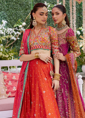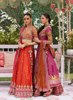 Introducing our captivating ensemble, a perfect harmony of elegance and traditional charm. This set features graceful net kaalis that add fluidity and movement, paired beautifully with a rich raw silk bodice and blockprint sleeves for a sumptuous feel. The ethereal net dupatta drapes effortlessly, adding a delicate touch that completes the look. The banarsi silk lehnga steals the spotlight with its intricate patterns and vibrant colors, making it a true showstopper. Enhanced with exquisite embellishments including tilla, resham, sequins, kora, dabka, and gotta, this ensemble sparkles and shines, catching the light and dazzling with every step. Ideal for weddings, festive celebrations, or special occasions, this outfit blends timeless craftsmanship with modern sophistication