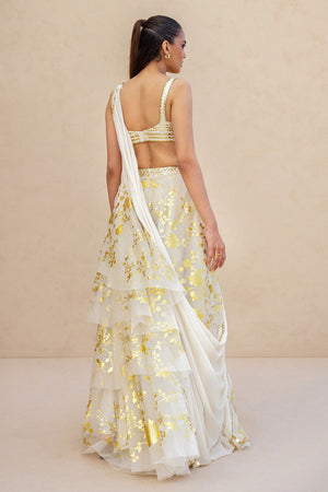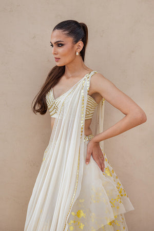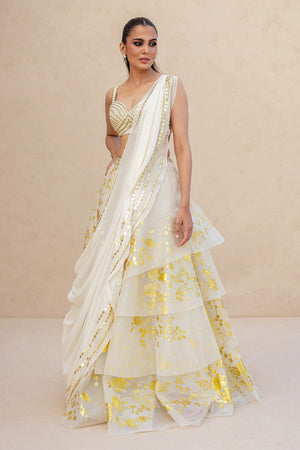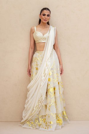 A whimsical ensemble features a sculpted pure rawsilk bralette in ivory adorned with geometric gold embellishment, blending strength with delicacy. Paired with a tiered lehnga skirt in organza, its layers shimmer with metallic florals in molten gold foil, catching the light with every movement. Draped across the shoulder, a soft georgette pre draped dupatta edged with understated detailing elevates the elegance to the modern silhouette. The palette of moonlit ivory and gilded accents creates a luminous harmony.