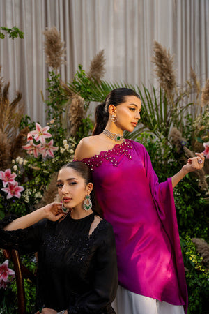 Magenta Berry is a statement piece crafted from luxurious satin silk, featuring an asymmetrical one-shoulder silhouette adorned with intricate beadwork and floral embellishments along the neckline. Paired with flowy bambi pants, this look strikes the perfect balance between effortless elegance and bold sophistication—designed to turn heads at any event.