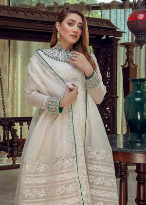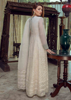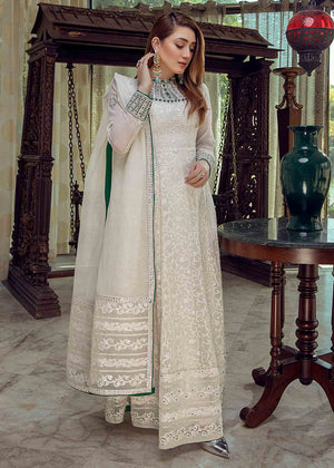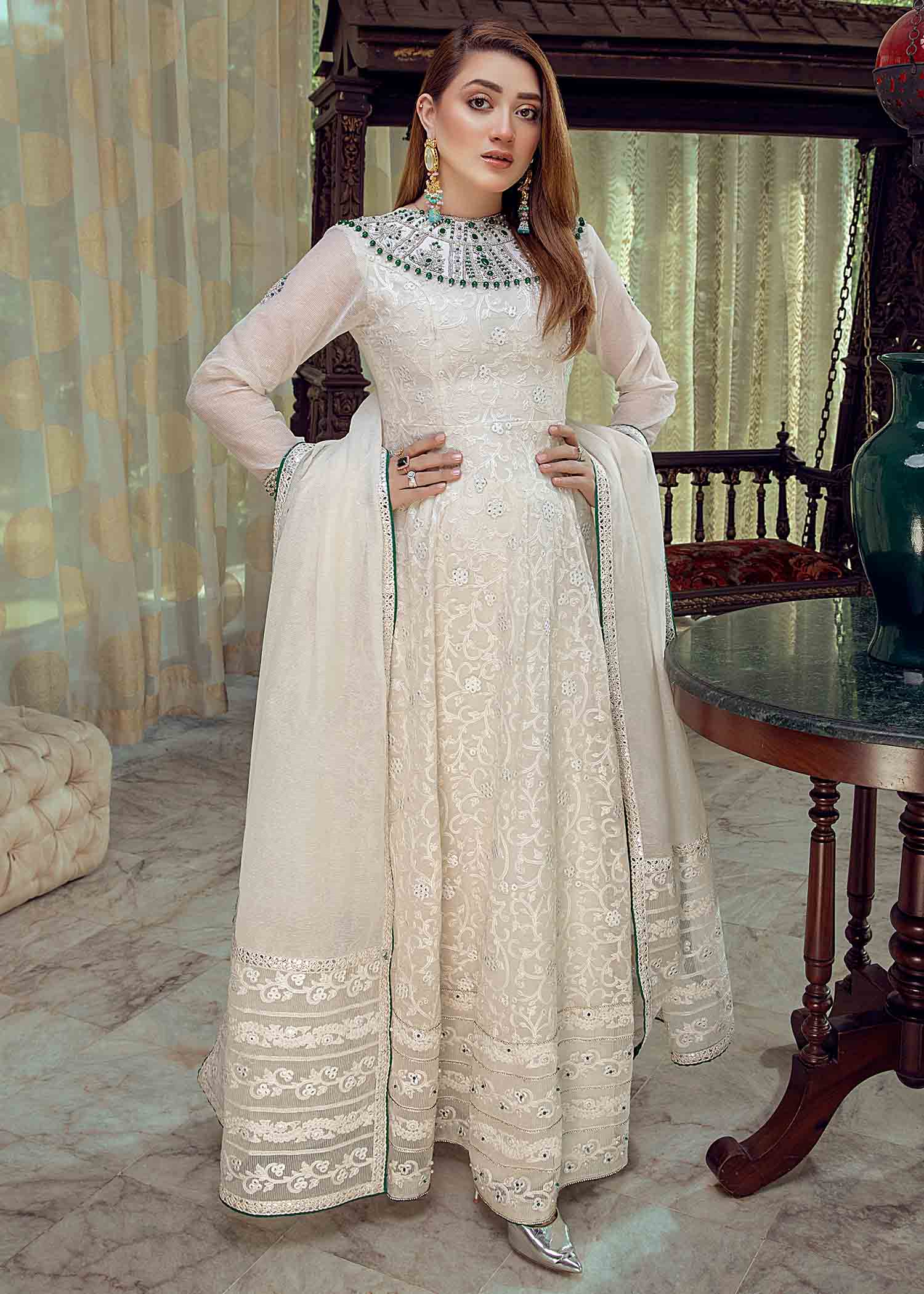 Description: Add this statement piece in a beautiful shade of Pearl white, heavily embroidered karandi Peshwas adorned with silver-chain & studded with emerald green crystals on the sleeve hem and neckline. Pair it with our matching pearl white karandi dupatta with lightly embellished border work on all four sides to add finesse to the look.