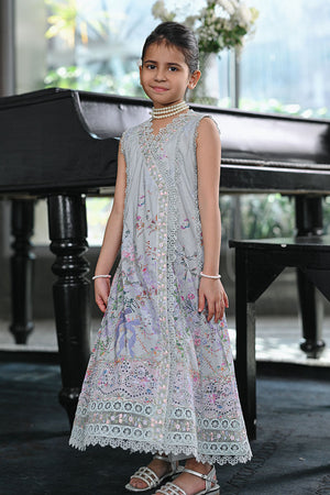 A refined dusty blue kalidaar, exquisitely crafted with fitted sleeves and detailed with embroidered organza borders and delicate lace accents. Paired seamlessly with tailored cigarette pants.
