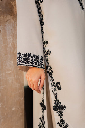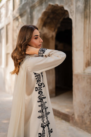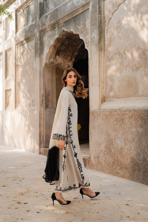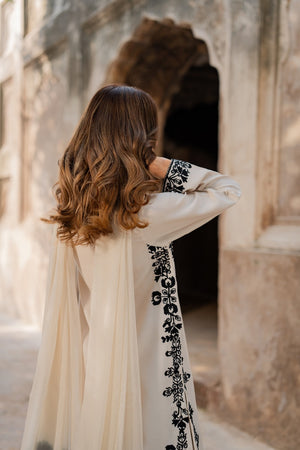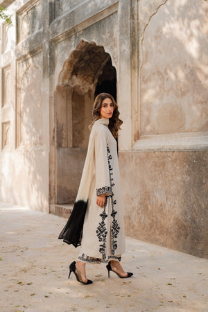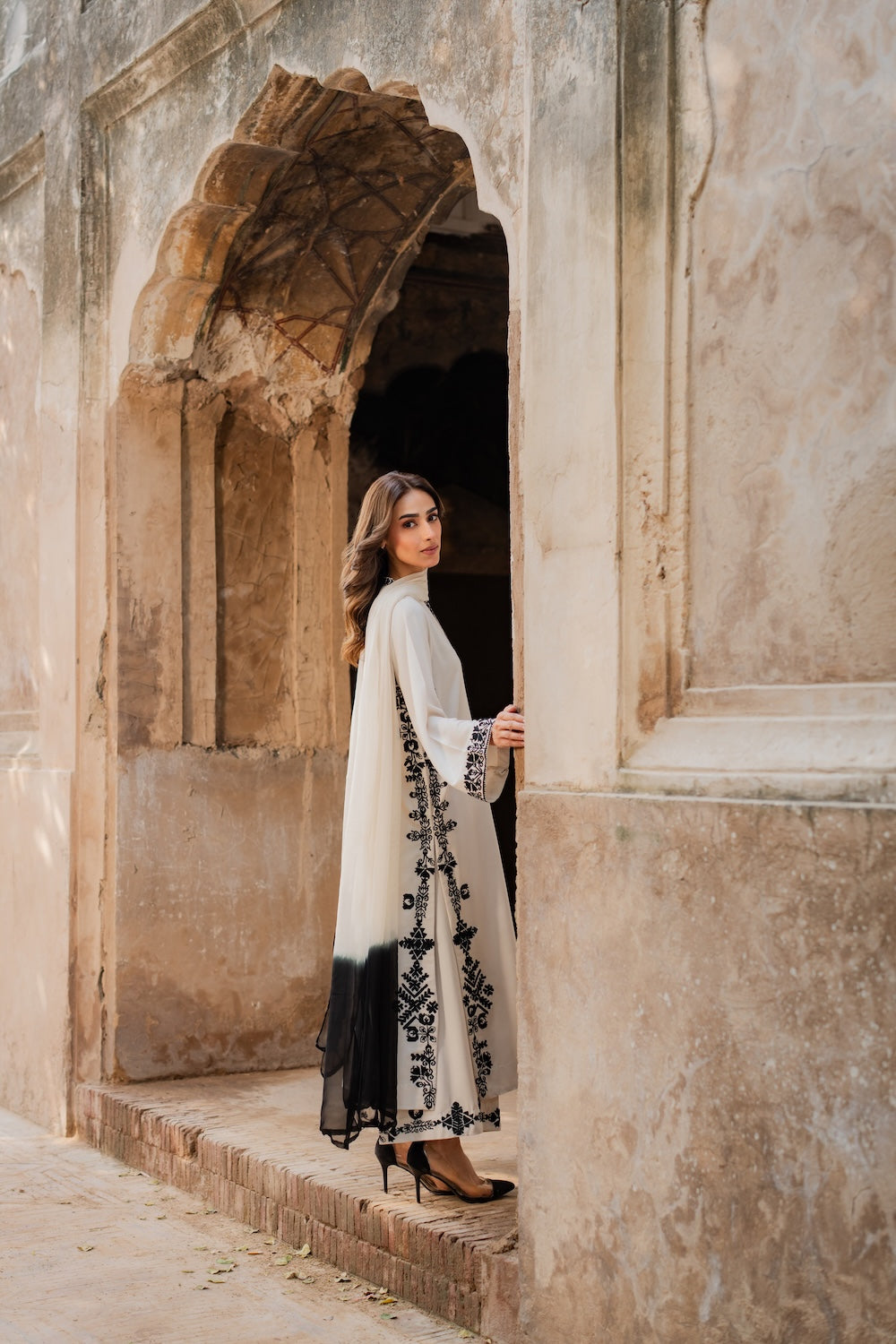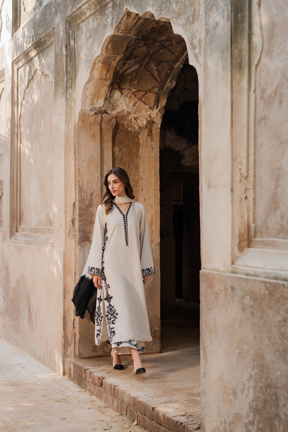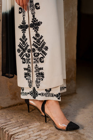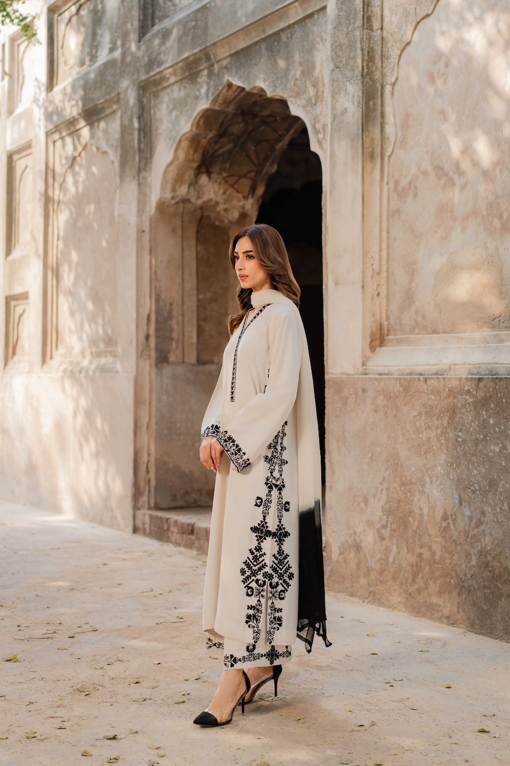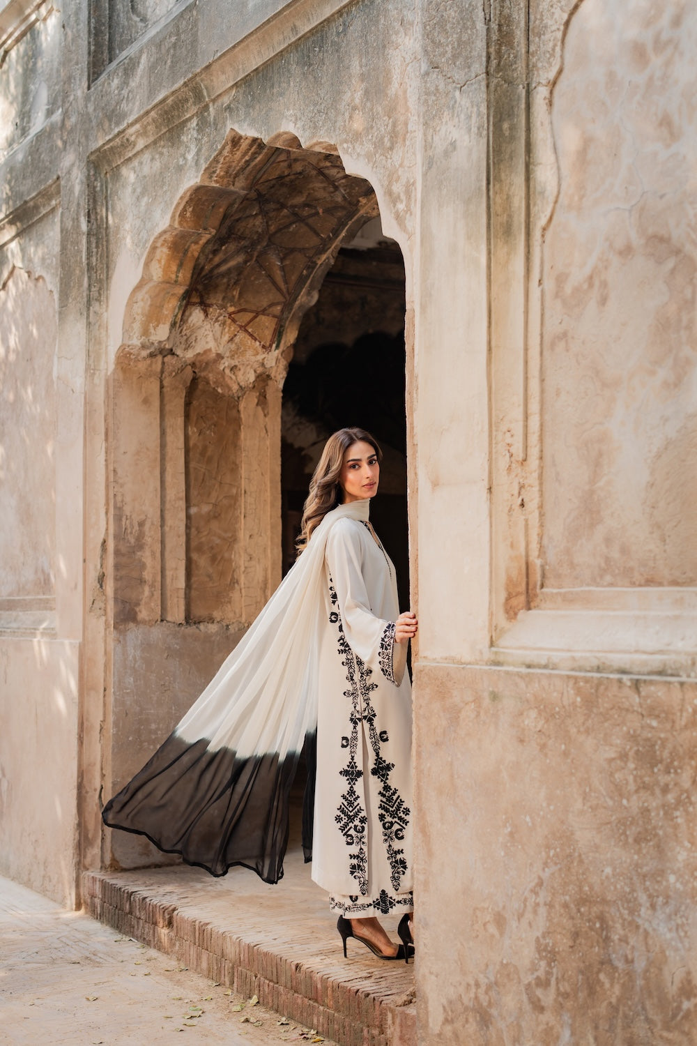 Monochrome magic—this outfit steals the spotlight with sleek black‑and‑white contrast and intricate Aari embroidery tracing the shirt sides, neckline, and pants. It is minimal, sophisticated, and utterly timeless. This outfit is your staple this season.