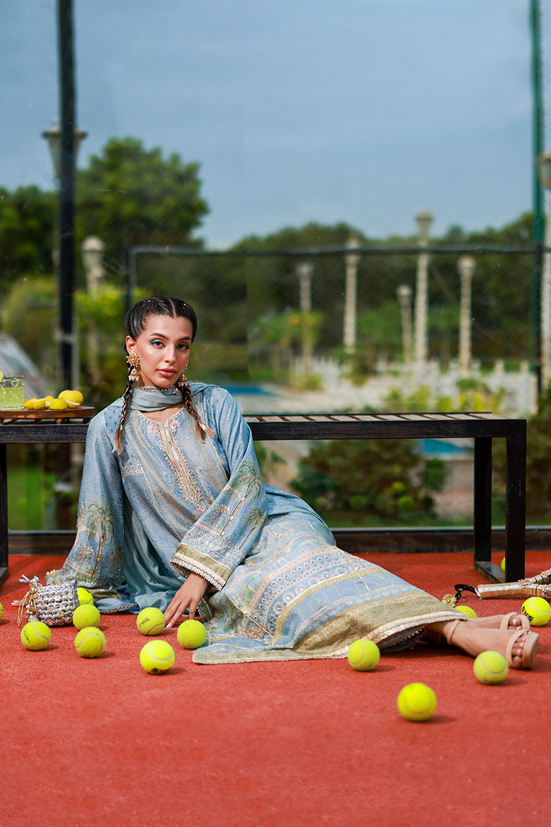 A graceful dusty blue raw silk long A-line shirt, styled with elegant bell sleeves and a classic kurta patti neckline. Paired with a Korean silk izaar detailed with gota work and a flowing printed medium silk dupatta, this ensemble beautifully blends timeless tradition with contemporary sophistication.