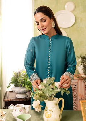 MAHIRA - a decent teal green matching set, intricate embellishment on sleeves, made with dabka, sequins and pearls. The long shirt with front slit features pearls and loops. Paired with chiffon embroidered and embellished dupatta.