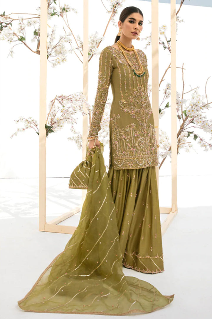 Mahjabeen features the richness of deep olive green color for this traditional mehndi bride look, curated on Korean raw silk. The short shirt silhouette is astonishingly embellished with timeless gotta, dabka, naqshi, and sitara, adding accent color of pinks. This heavenly silhouette is paired with Korean base gharara, with beautiful hand embellished details on the hem, and an organza dupatta with gotta and spray on it.The shipping charges for all articles barring Bridals are as follows: