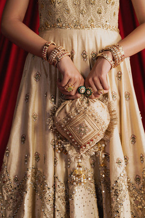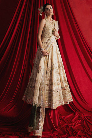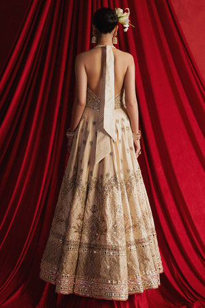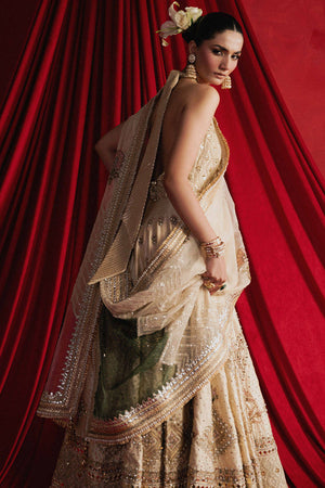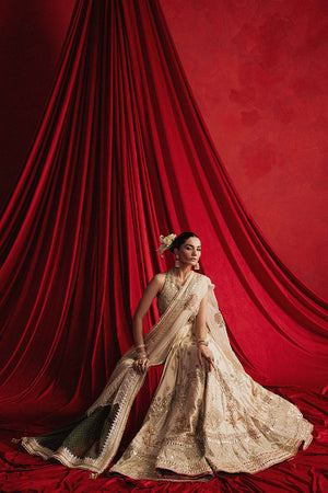 Mahjabeen is soft, white, and crafted in cream Indian silk, the ensemble is steeped in old-world techniques: silk appliqués, block print, adda embroidery, and glimmering mirror work. The choli is cut in a halter style, accentuated by Mughal jaali patterns in threadwork that enclose delicate gota patti florets like latticework backlit by sunrise. The panelled lehenga begins with a gentle spray of ascending Mughal motifs stitched in thread, building into wave-like chevrons, and ending in an explosion of large floral motifs reminiscent of miniature garden murals. These are all bordered with wide bands of embroidery, mirror work, and hand-done Mughal jaali inspired designs. The organza dupatta is an artwork in itself, featuring chevrons in sequins on both ends, scattered Mughal florals, and four glistening borders in gota and adda, each edge finished in soft golden kiran