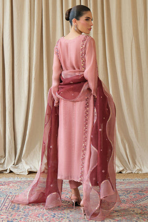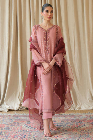 Mahnoor is rendered in a soft blush-rose cotton net, gently deepening into a rich mulberry hue. This romantic two-tone palette evokes the quiet luxury of twilight skies, delicately hand-embroidered with tonal resham and scattered sequins that catch the light with every movement. Comes with straight pants and can be paired with a hand-embellished scalloped organza dupatta.