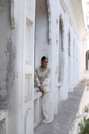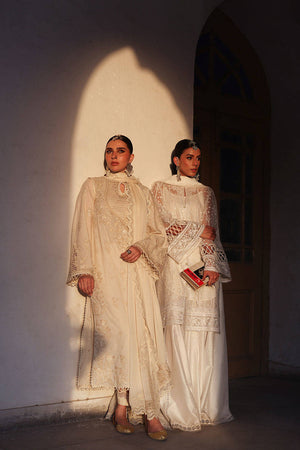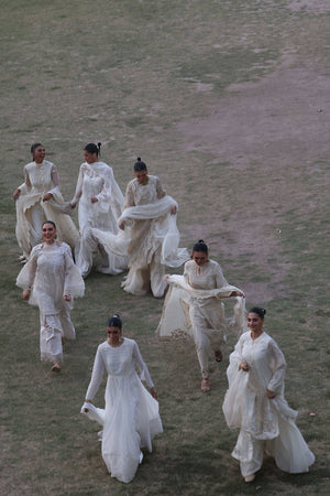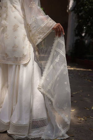A sheer organza shirt detailed with pintucks at the neckline and a graceful keyhole slit, this ensemble is adorned with delicate floral bouquets, hand-placed and accented with pearls. The shirt is finished with a mix of intricate laces and trims, adding gentle texture. The sharara features organza panels near the hem and soft pintuck accents, ending in subtle trims that draw the eye. A scalloped lace dupatta, finished on all four sides, sparkles with glittering motifs and block-printed detail. Giving you an Eid ensemble that feels festive without excess