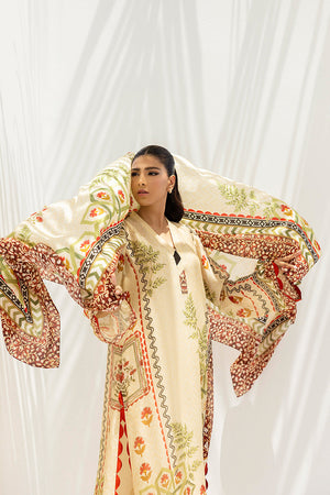Rendered in warm almond beige chevron on a cream canvas, this ensemble blends tradition with a contemporary edge. The cotton net shirt features symmetrical botanical vines and geometric patterns in earthy olive, rust, and deep brick red. Delicate floral bunches and scalloped 3D borders enrich the hem and sleeves, while the flowing medium silk dupatta echoes the motif story through floral grids, trailing vines, and classic borders in complementary tones, forming a rich visual tapestry. Finished with pure raw silk tapered trousers detailed at the hem.
