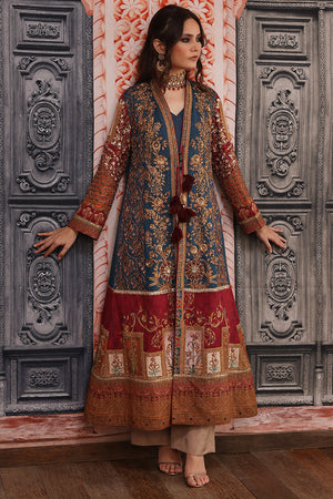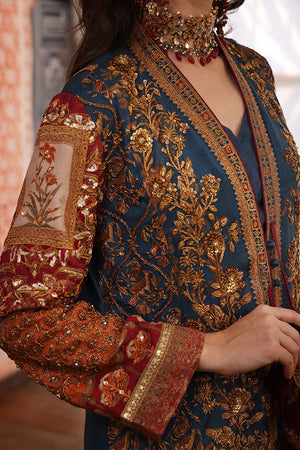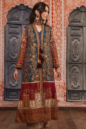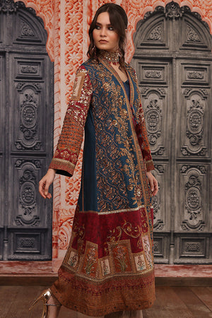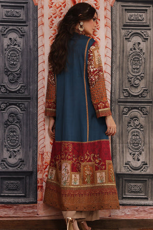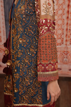 Original Shamaeel silhouette. Beautiful traditional print on silk fabric handcrafted antique gold zardozi work on the front and on the sleeves with beautiful handcrafted tassels and print enhanced with antique gold tila embroidery. This heavy article is paired with plain blue inner and coffee colour straight pants. You can order through website or call or have an appointment with Shamaeel to customize colors of your choice.The shipping charges for all articles barring Bridals are as follows: