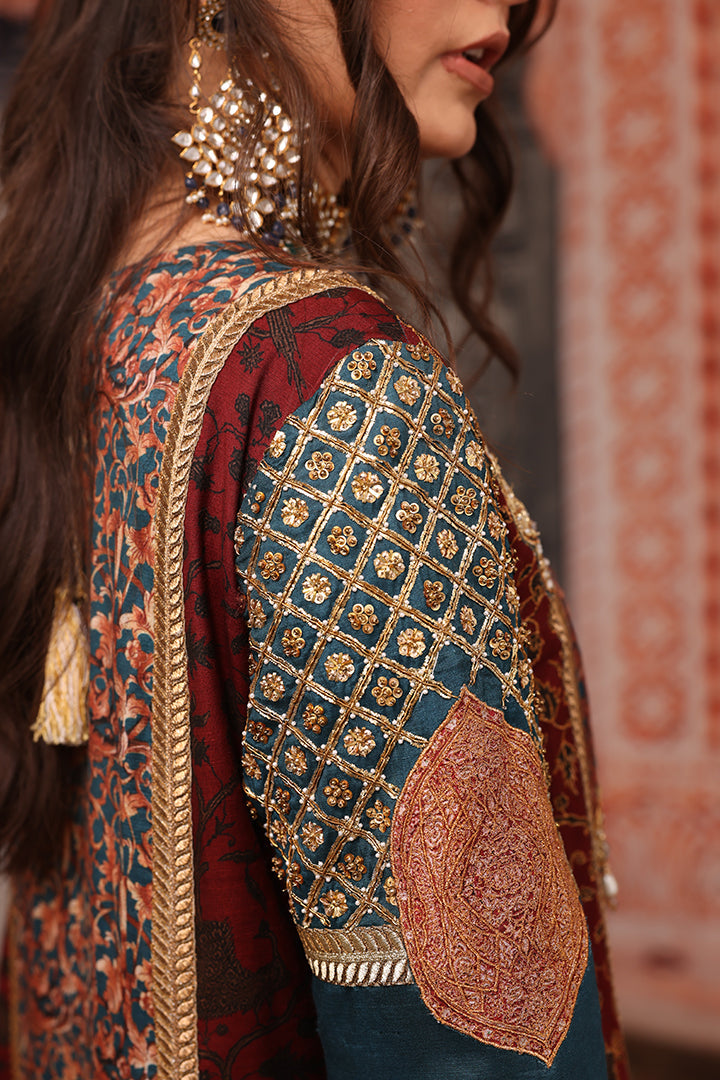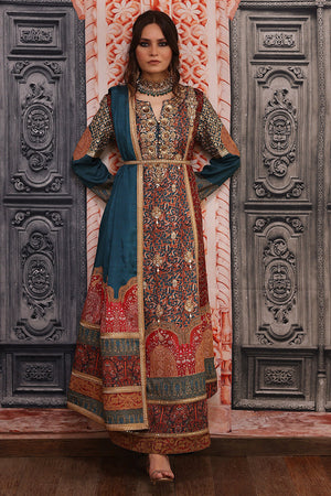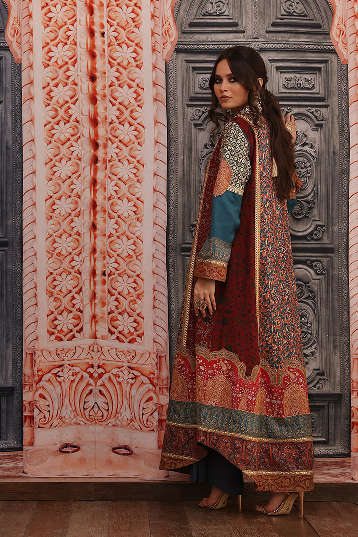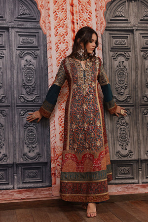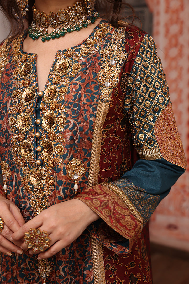 Unique original Shamaeel silhouette traditional digital print on silk fabric delicate embellished galla and sleeves created with antique gold dapka, naqshi, sequins, pearls, resham thread and antique tila thread intricate embellished motifs on overall front panel finished with delicate tila thread and sequince handcrafted lace. The beautiful outfit for this wedding season is paired with beautiful digital printed stole and straight pants of your choice. You can order through website or call or have an appointment with Shamaeel to customize colors of your choice.The shipping charges for all articles barring Bridals are as follows: