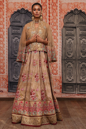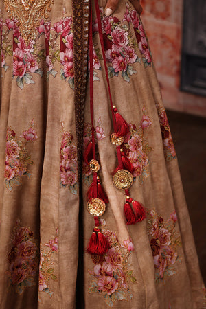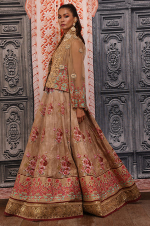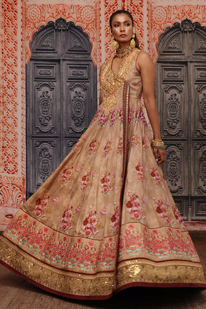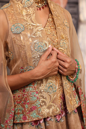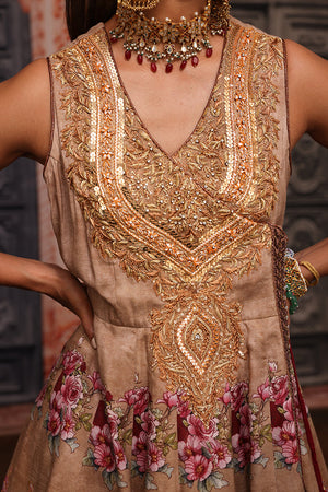 Floor length long traditional angarkha digital print on silk fabric intricate hand embellished galla created with antique gold zardozi work finished with beautiful delicate resham thread, tila thread and sequins motif and border. Paired with unique organza jacket intricate hand crafted resham thread embroidery and sequins work on the jacket sleeves and collar. Hand embroidered booti on overall jacket. You can order through website or call or have an appointment with Shamaeel to customize colors of your choice.The shipping charges for all articles barring Bridals are as follows:
