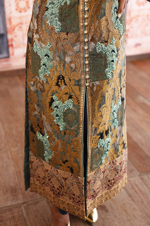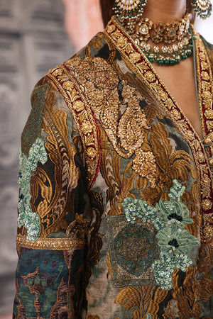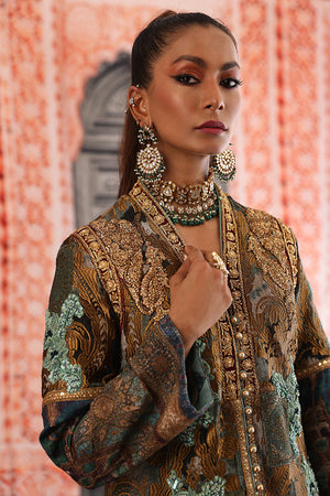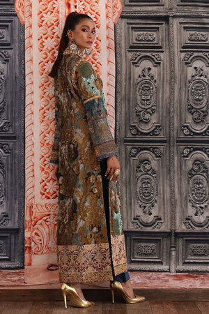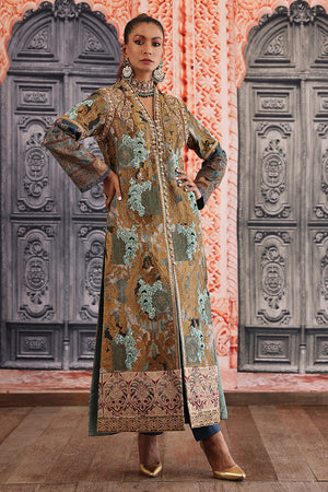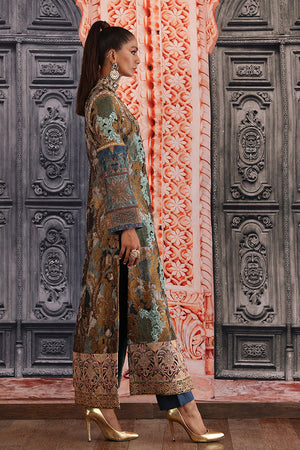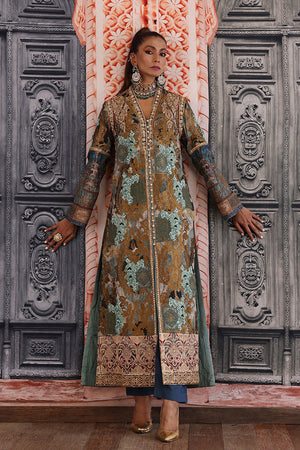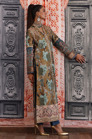 Straight long silhouette ikat inspired digital print on silk fabric overall bold antique tila thread embroidery on the print delicate dull ferozi floral motifs made with resham thread and sequence intricate hand embellished galla and arm hole patti finished with elegant resham thread border and paired with plain blue straight pants. You can order through website or call or have an appointment with Shamaeel to customize colors of your choice.The shipping charges for all articles barring Bridals are as follows: