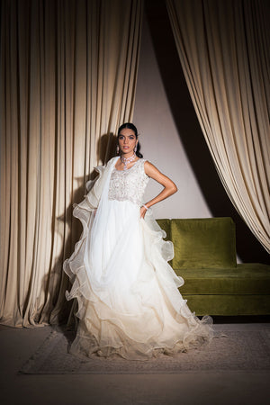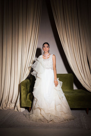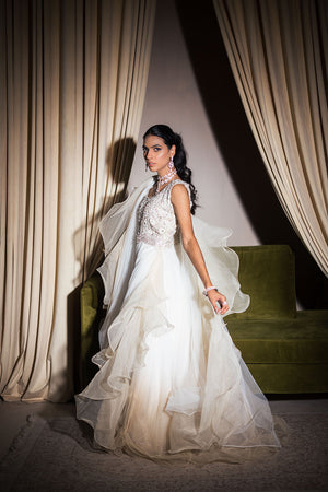 A heavily embellished pure organza bodice is exquisitely embroidered and sits on luscious layers of delicate pearl white net in this dreamy dress. The bodice features gorgeous geometric embroidery accented with hand embellishments. An attached ruffled dupatta adds a dramatic flare to the ensemble.