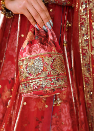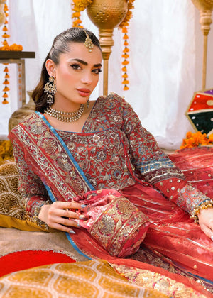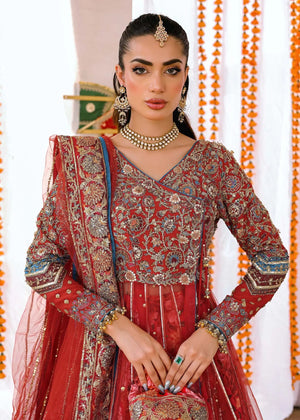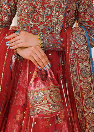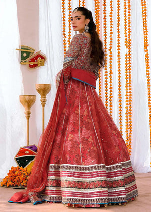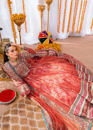 This wedding season, we proudly present an exquisite red angrakha, featuring intricate block prints elegantly showcased on the body and sleeves, complemented by exquisite embellishments. The stunning borders elevate its overall appeal. It comes paired with a beautifully digitally printed shamoos silk lehenga, while the embroidered net dupatta adds an artistic flair to the ensemble, completing the look with unparalleled elegance.