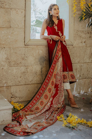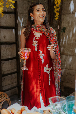 A carmine red pure khaddi net shirt with hand embellished motifs with bird detailing; finished with a printed silk border. It has been paired with a digitally printed silk dupatta and white raw silk pants with button detailing.